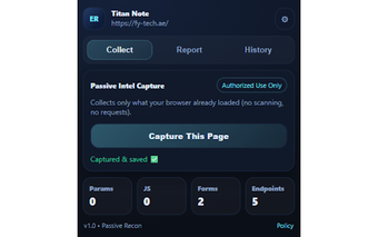 Titan Note es una extensión para Chrome diseñada específicamente para la documentacion de inteligencia sobre aplicaciones web durante pruebas de seguridad autorizadas. Esta herramienta permite a los hackers éticos, investigadores de seguridad, desarrolladores y estudiantes recopilar y organizar datos de reconocimiento de manera eficiente. Entre las características principales se incluye la recopilación pasiva de información como URLs, archivos JavaScript, formularios y metadatos de la página, todo estructurado en informes claros que pueden ser exportados para su documentación posterior.